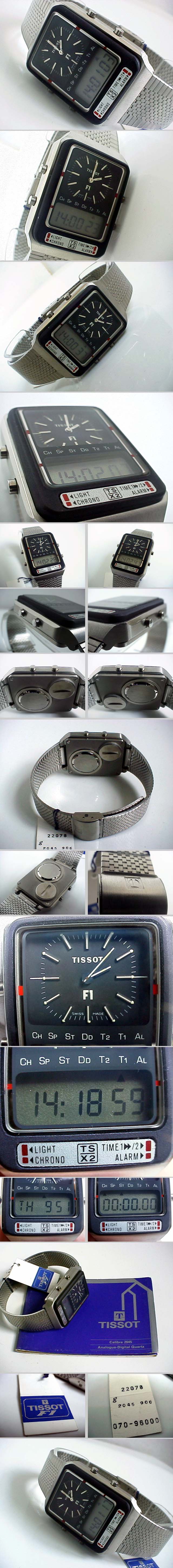 Tissot F1 ana-digi LCD Uhr Modell TS X2 Frühe Formula 1 Digitaluhr von Tissot mit analog und digitaler Anzeige, etwa 1978. Kaliber 2045. Schweizer Digitaluhr mit gemischter Anzeige. Hochwertige Ausführung in Massiv-Edelstahlgehäuse und Mineralglas. Alarm, Stoppuhr, 2. Zeitzone, Licht. Das Modul ließ sich Tissot am CEH (Centre Electronique Horloger) in Neuchatel entwickeln, nachdem dieses die Entwicklung der Beta 21 abgeschlossen hatten. Der Clou bei dieser Uhr sind die 4 Drücker: Tissot hat hier den Aufwand betrieben, Drücker mit einem Druckpunkt zu verwenden. Es macht richtig Spaß diese Drücker zu bedienen. Leider wurde solche Drücker bei anderen Uhren nie verwendet. Early digital watch from Tissot, modell TS X2, ca 1978. Caliber 2045, developped by CEH (Centre Electronique Horloger) in Neuchatel. Alarm, chronograph, second time zone indication and light function. All stainless steel and mineral glass. |